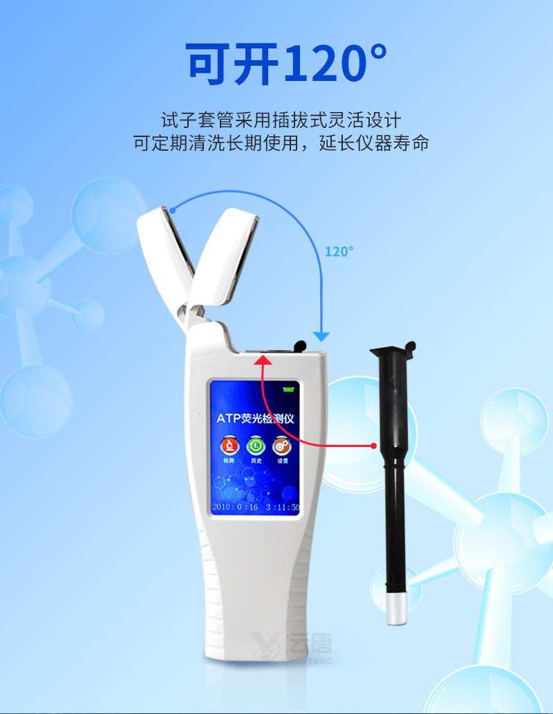 ATP熒光檢測儀操作采用生物化學反應方法檢測ATP含量,ATP熒光檢測儀基于螢火蟲發光原理,利用“熒光素酶—熒光素體系”快速檢測三磷酸腺苷(ATP)。ATP拭子含有可以裂解細胞膜的試劑,能將細胞內ATP釋放出來,與試劑中含有的特異性酶發生反應,產生光,再用熒光照度計檢測發光值,微生物的數量與發光值成正比,由于所有生物活細胞中含有恒量的ATP,所以ATP含量可以清晰地表明樣品中微生物與其他生物殘余的多少,用于判斷衛生狀況。