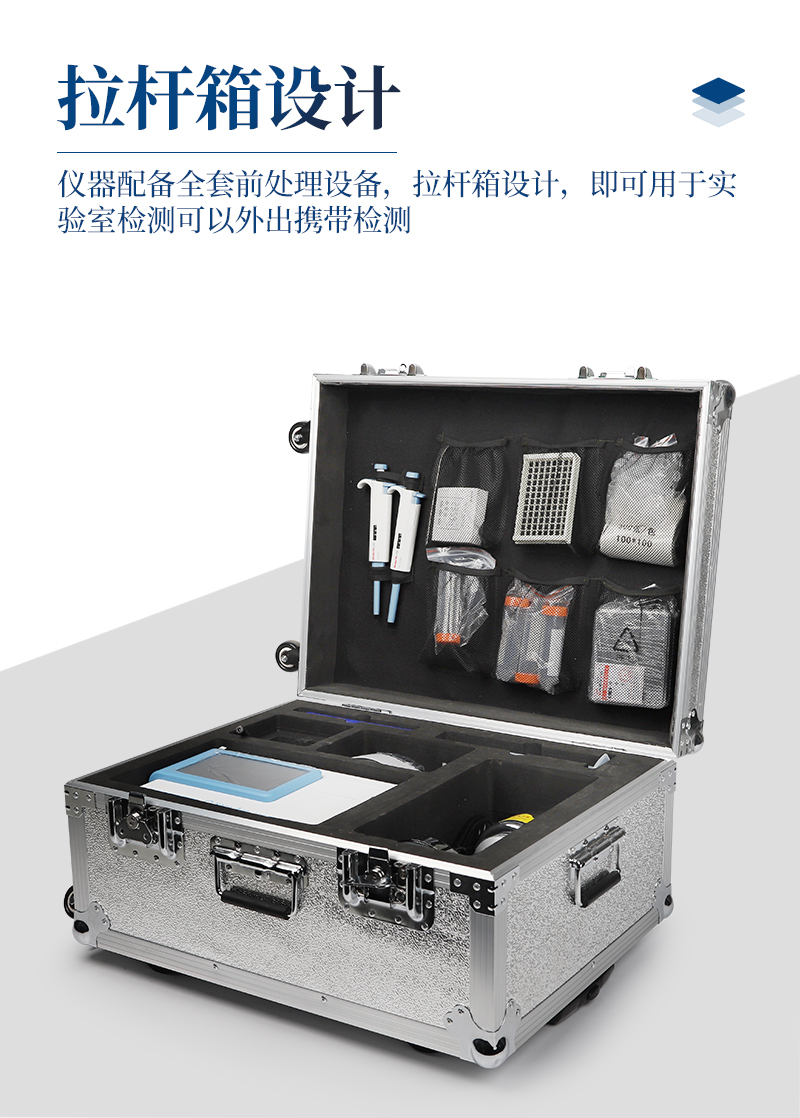 12、儀器配備全套前處理設備,拉桿箱設計,即可用于實驗室檢測可以外出攜帶檢測。
